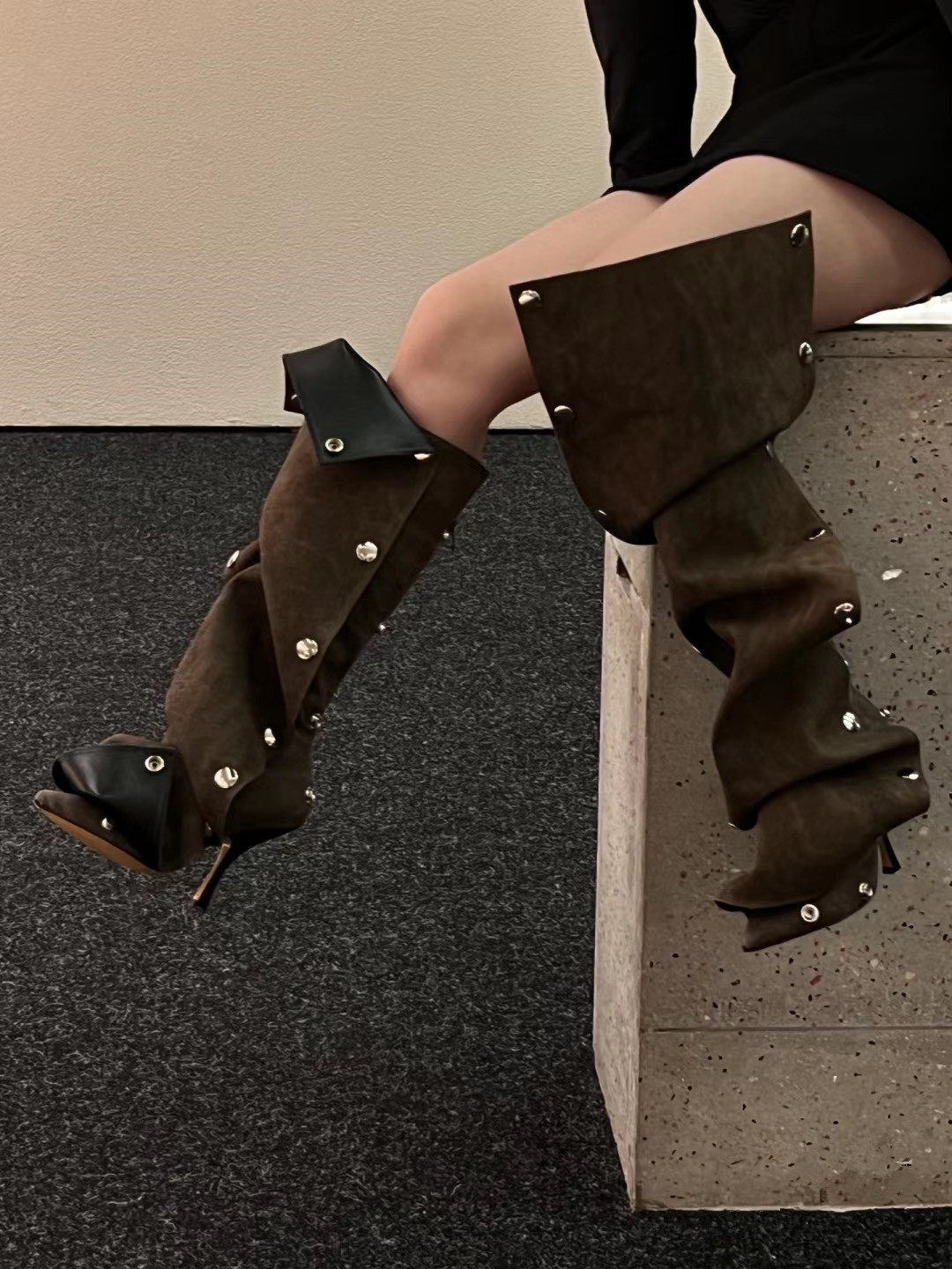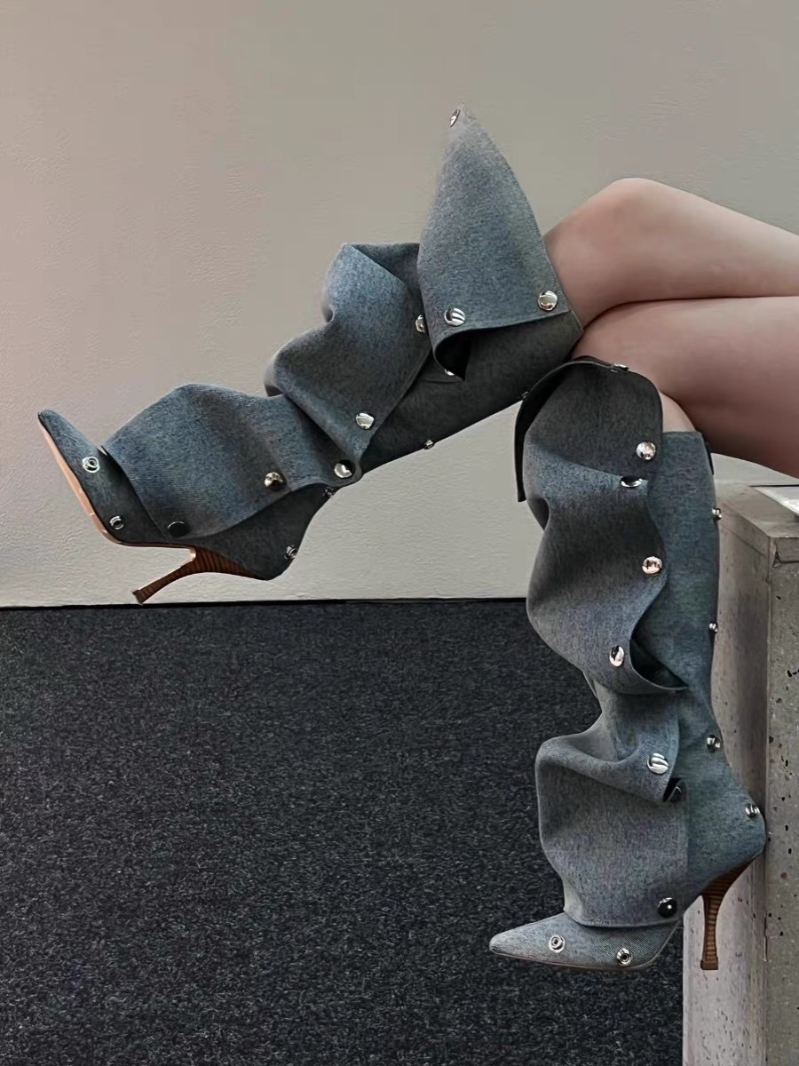 Stud Pleated Cowboy Boots : Pointed Toe High Heels