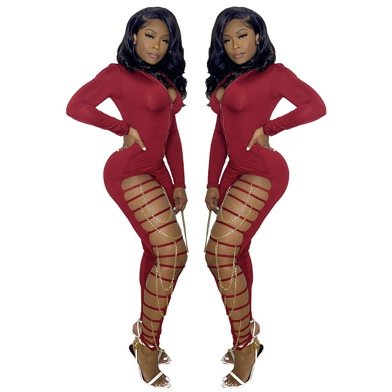 A form-fitting, long sleeve jumpsuit in a burgundy color. It features a zipper front closure and unique thigh strap detailing with gold chains. Material is stretchy, synthetic blend design to accentuate the body curves.