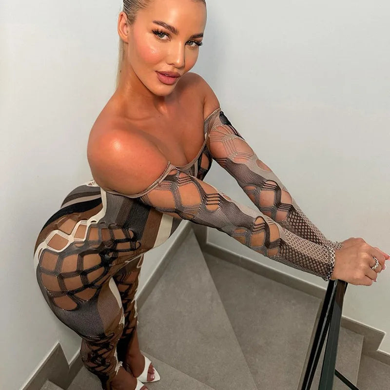 A form-fitting jumpsuit with vertical stripes in a shades of gray, white, and brown. Features strategically placed cutouts on the sides, legs and chest creating a revealing and edgy look. The sleeves are made of a mash material. The overall design is bold and attention-grabbing.