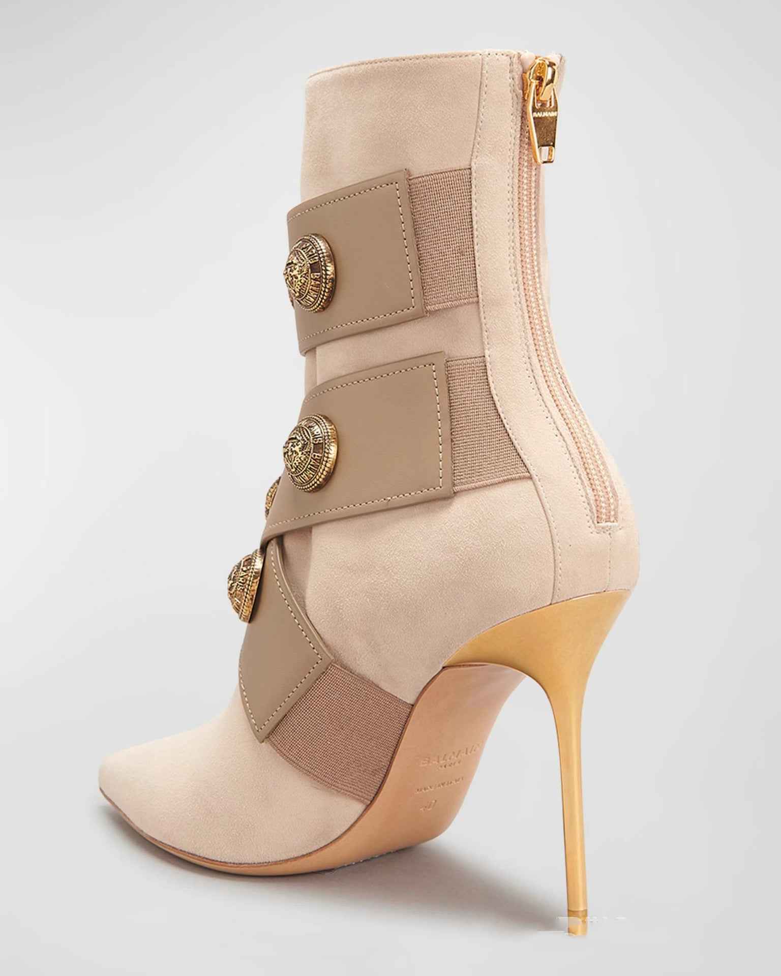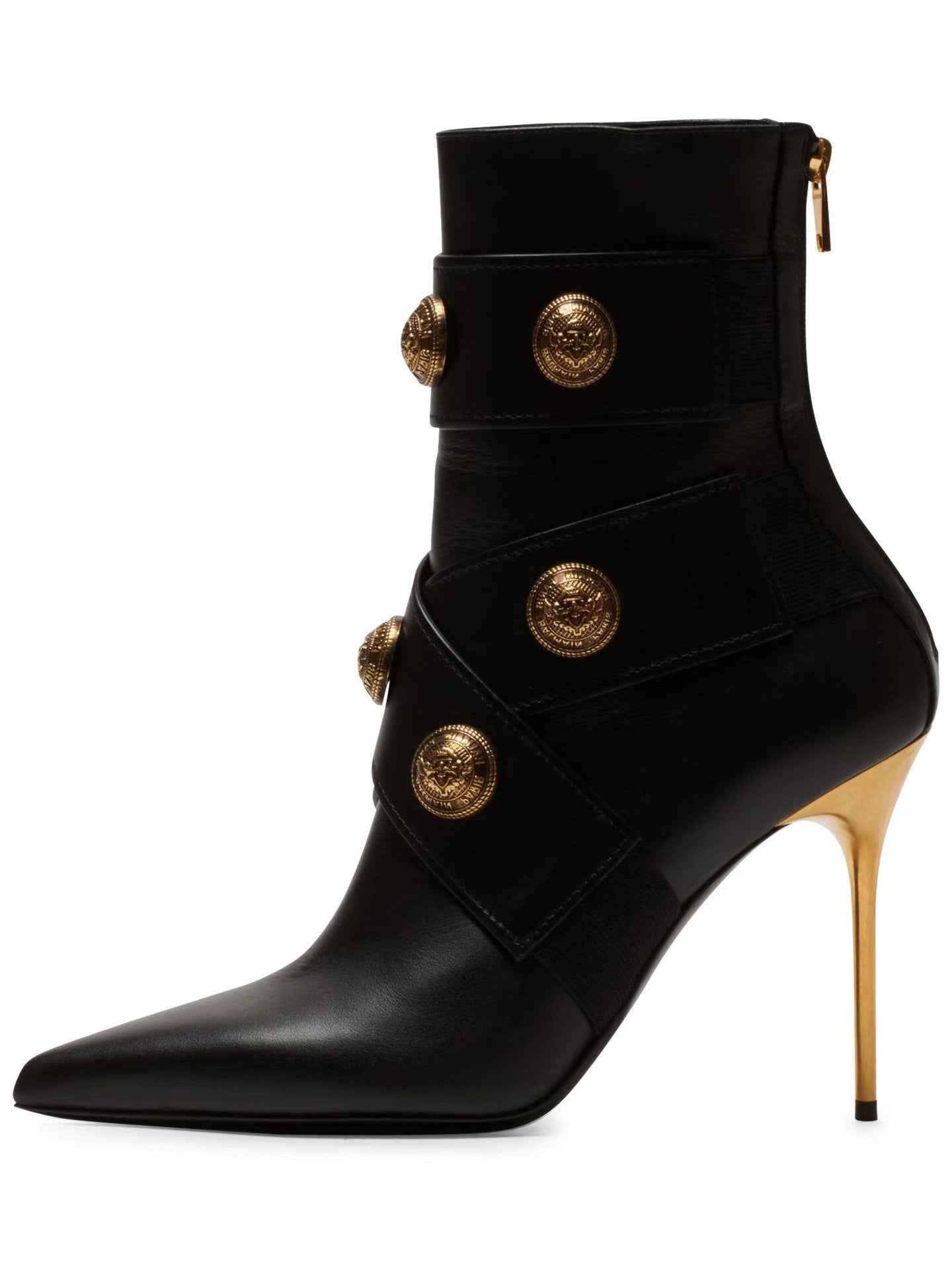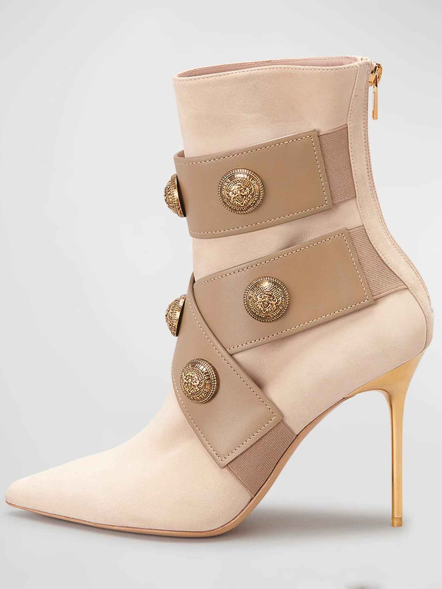 Gold Round Badge Short Boots : Pointed Toe Metal Stiletto Heels